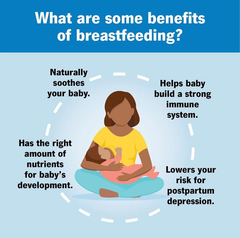 Breastfeeding has many benefits for you and your baby. It helps build your baby’s immune system and offers the perfect nutrition. Some of the health benefits to you include a lower risk of breast and ovarian cancer.