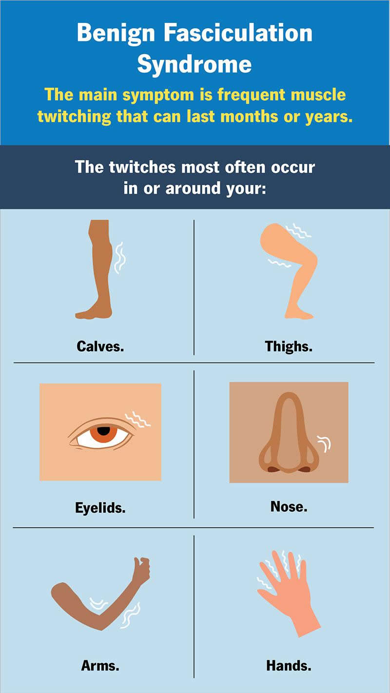 Researchers don’t know the exact cause of benign fasciculation syndrome. But they know that muscle twitches are associated with the following: