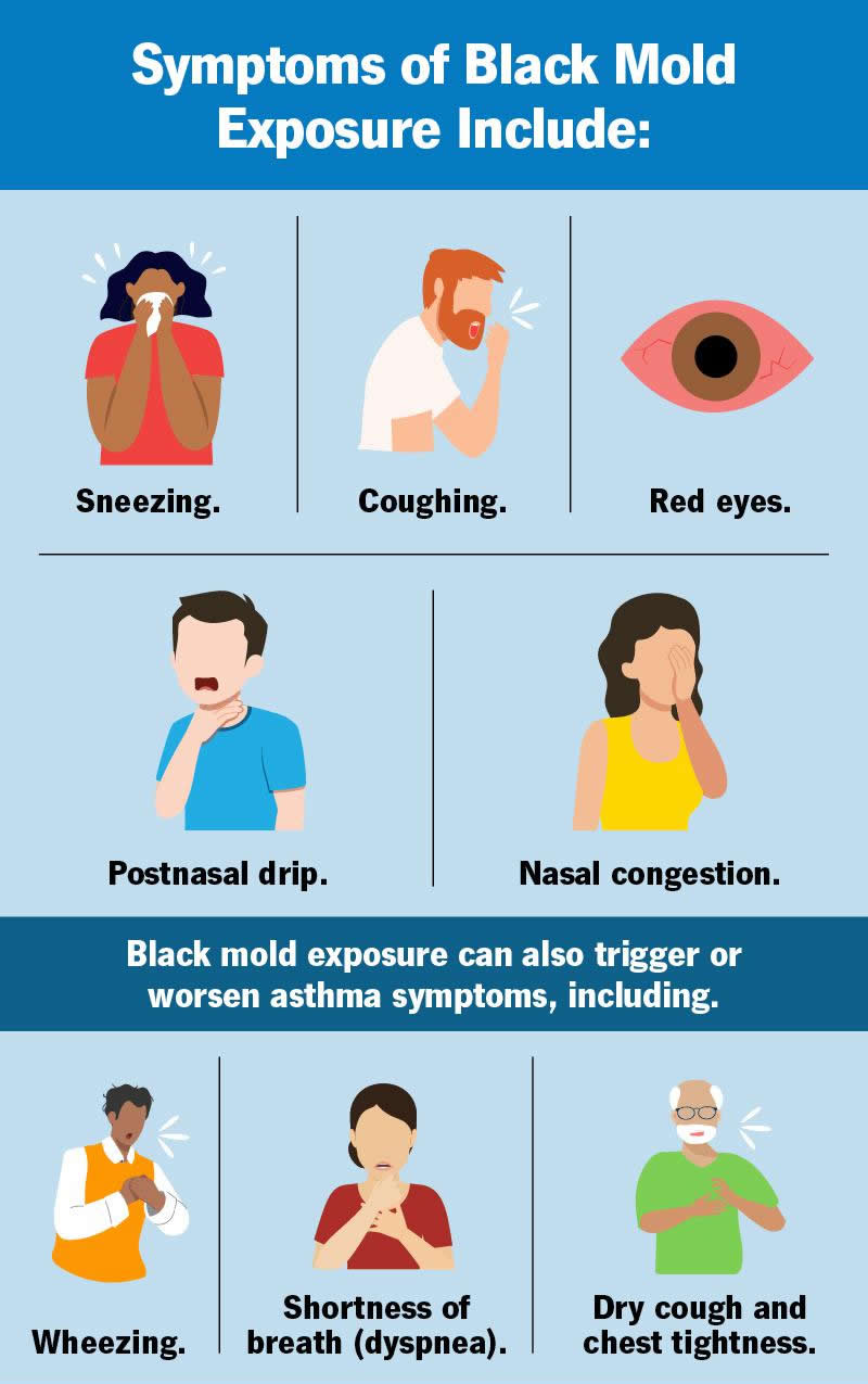 Black mold exposure can also trigger or worsen asthma symptoms, including: