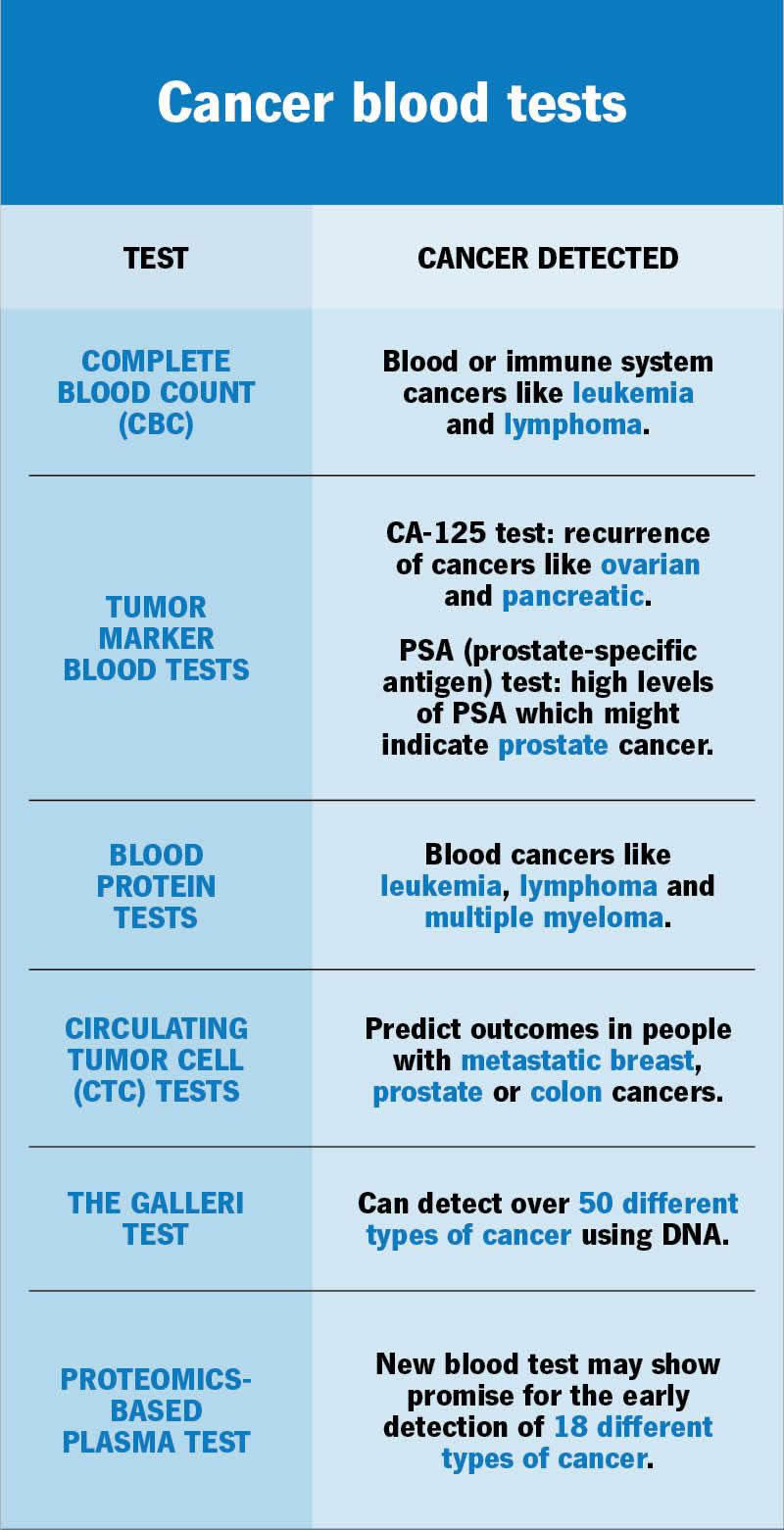 - Tumor marker blood tests. These tests identify certain chemicals released into your bloodstream every day. High levels of these chemicals in the blood can be a sign of cancer. The CA-125 blood test is one common tumor marker test commonly used to plan treatment and check for the recurrence of certain cancers (like ovarian and pancreatic). The PSA (prostate-specific antigen) test is a tumor marker test that checks for high levels of PSA in your blood. PSA is a protein your prostate makes. Elevated levels might indicate prostate cancer.