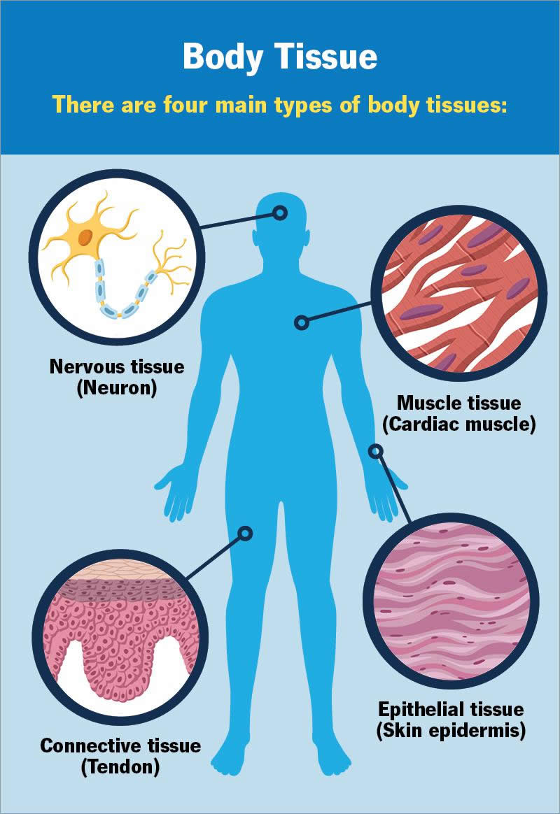 One step up from cells are tissues. These collections of cells handle specific jobs throughout your body. There are four main types of tissues: epithelial, connective, muscle and nervous. But people commonly use the term “tissue” informally to talk about parts and structures throughout the body, too.