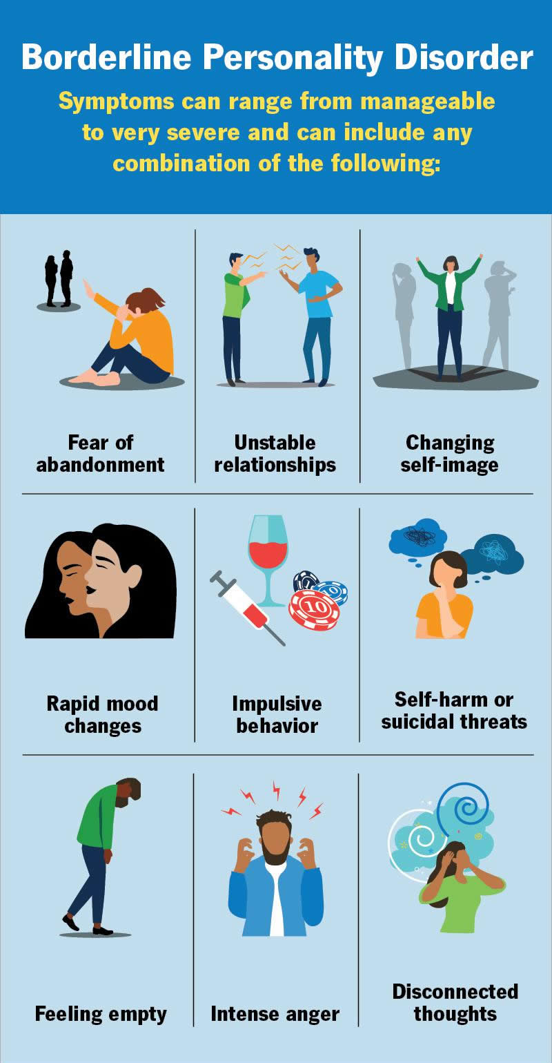 Borderline personality disorder (BPD) is a mental health condition. You may have extreme mood swings, unstable relationships and trouble controlling your emotions. You have a higher risk of suicide and self-destructive behaviors. Talk therapy is the main treatment for BPD.