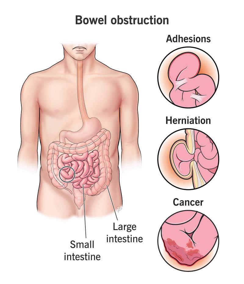 A bowel obstruction is a partial or complete blockage of your small intestine or large intestine (bowels). The most common causes include scar tissue forming after abdominal surgery, hernias and colon cancer. A bowel obstruction is a medical emergency that requires immediate care.