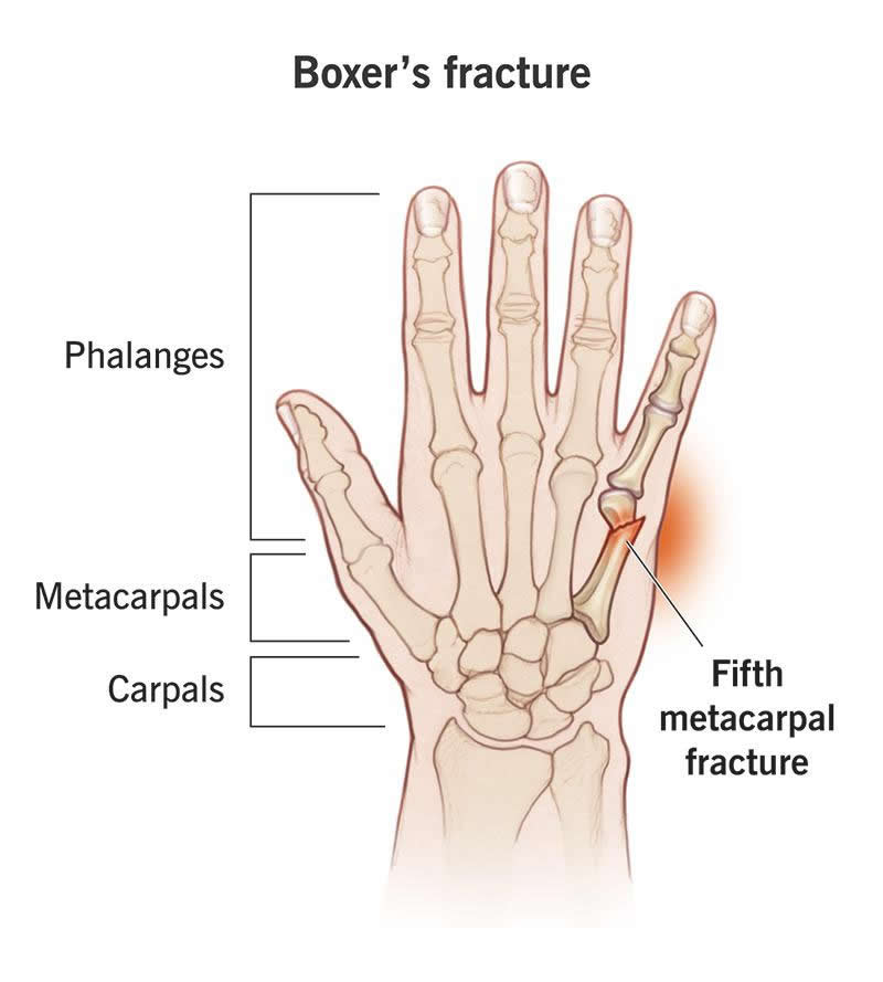 Boxer’s fractures get their name for how they usually happen: Punching something hard with a closed fist. They’re a type of broken bone, specifically the bone in your hand that connects to your pinkie finger. You’ll probably need to wear a splint or cast and take a break from sports for six to eight weeks.