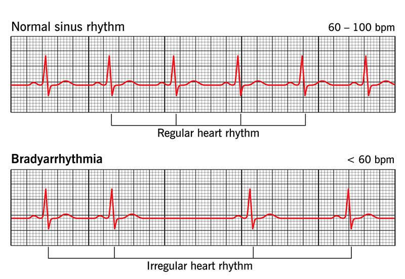 A bradyarrhythmia is a heart rate that’s slower than typical because of an irregular heart rhythm. People with bradyarrhythmia have resting heart rates below 60 beats per minute. For most adults, a resting heart rate of 60 to 100 beats per minute is considered normal.