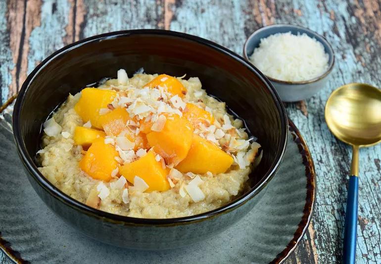 No matter where you wake up, catch a tropical vibe with this breakfast bowl built with mango chunks, coconut flakes and whole-grain oats. It’s enough to turn a breakfast table into your own island retreat.