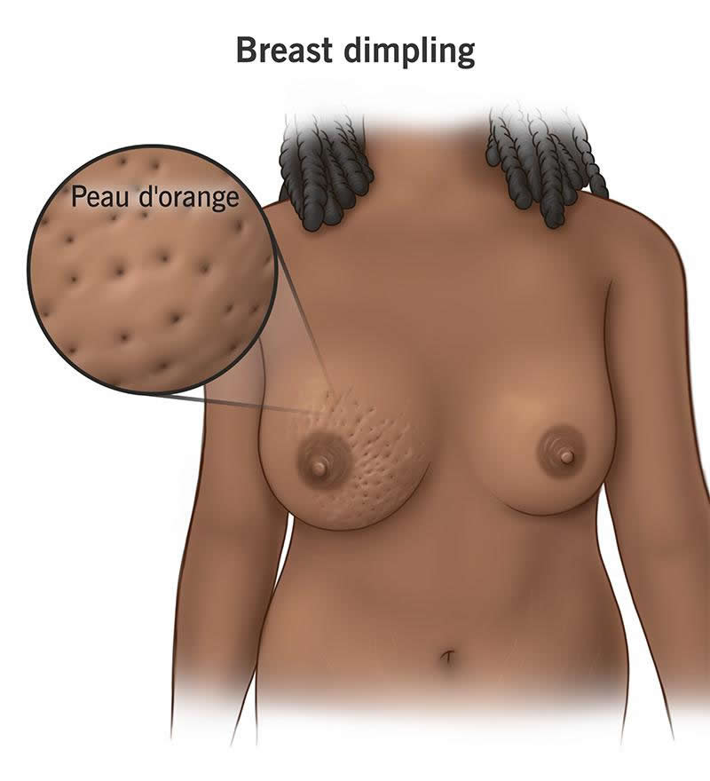 The change in your breast skin may be a breast cancer symptom. But other breast disorders can also cause breast dimpling. Any change in your breast can be a cause for concern. Talk to a healthcare provider if you have breast dimpling. They’ll find the cause and recommend any treatment you may need.