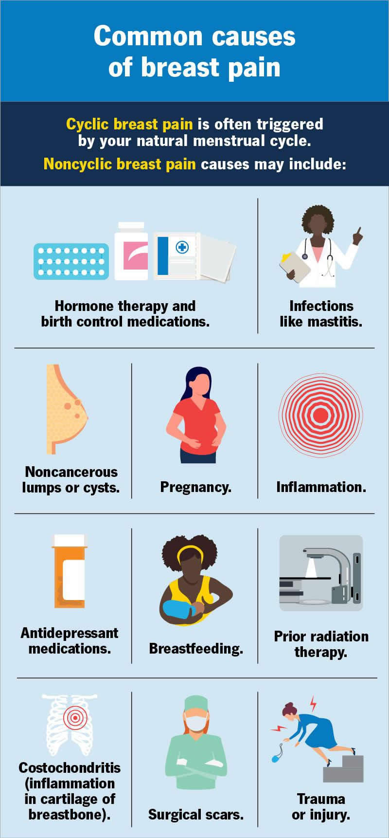 Cyclic breast pain is often triggered by your natural menstrual cycle. Noncyclic breast pain causes may include: