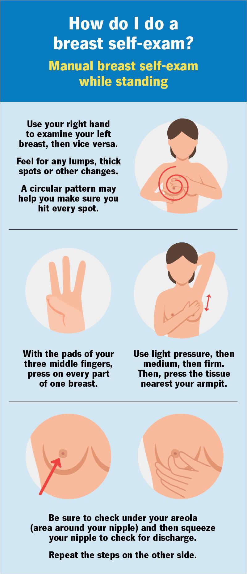 You should examine your breasts both visually (with your eyes) and physically (with your fingers). Keep in mind that your breast tissue extends to your armpit, collarbone and top of your abdomen. Your breast tissue isn’t just your breast cleavage and nipples. A breast self-exam takes only a few minutes.