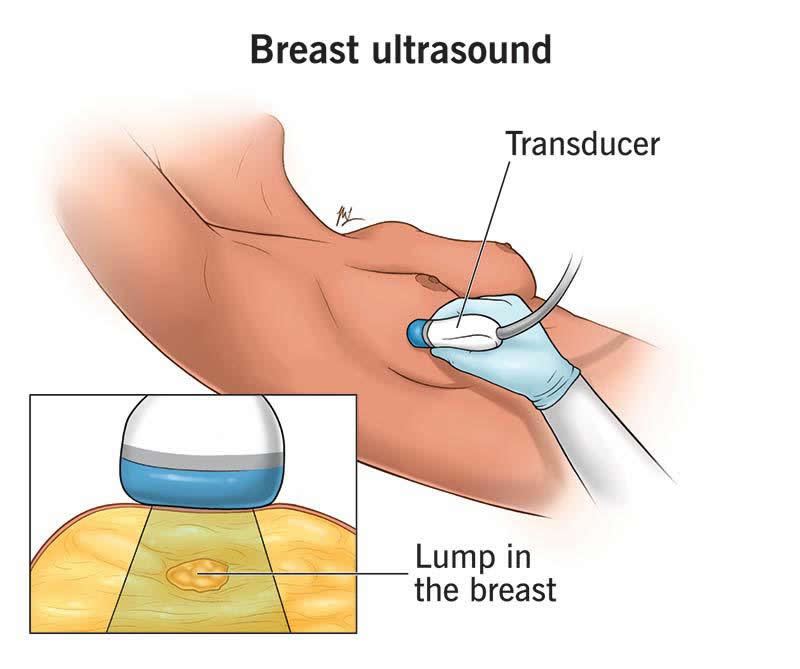 To get images of the inside of your breast, an ultrasound technician moves a handheld device (transducer) over your breast and surrounding tissues. The transducer uses high-frequency sound waves to take pictures of the tissues and structures inside. The technician uses a computer monitor to look at the images the transducer collects.