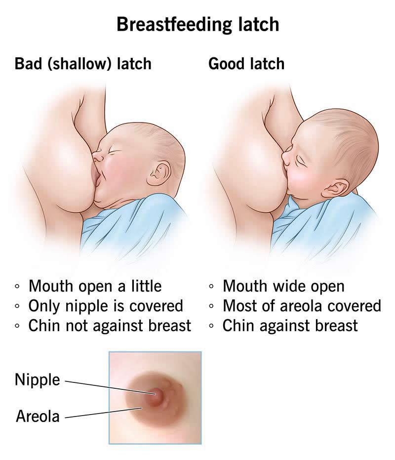 A good breastfeeding latch means your baby’s mouth is wide open and covers most of the bottom part of your areola. Some of the top part of your areola should be visible above your baby’s upper lip. Their chin should rest against your lower breast. A bad, or shallow, latch means your baby is only suckling on your nipple. This causes nipple pain.