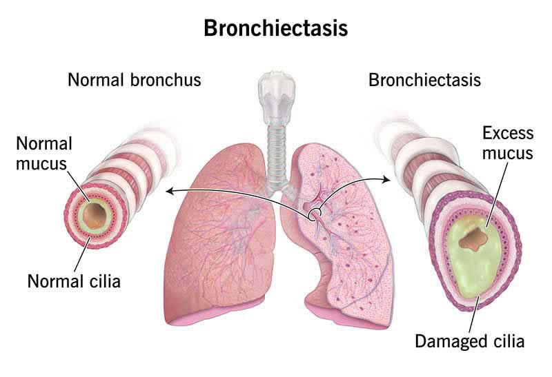 Bronchiectasis (“bronk-ee-EK-tuh-sis”) is a lung condition where your airways (tubes going into your lungs) get damaged and widen. Damaged airways can’t clear mucus like they're supposed to. Bacteria then grows in the mucus, causing more inflammation and damage to your lungs. This makes you cough a lot as your body tries to remove the infected mucus.