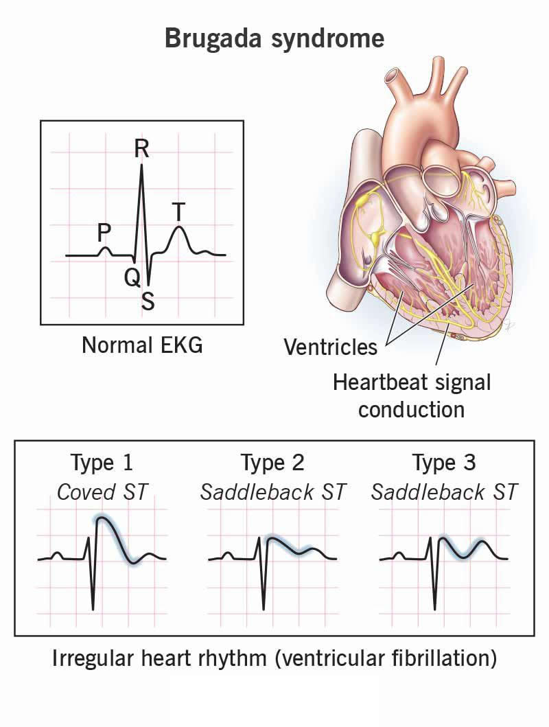 Brugada syndrome is a disease that can cause an abnormal rhythm in your heart’s lower chambers (ventricles). This irregular heart rhythm, ventricular fibrillation (v-fib), prevents your heart from pumping blood to your brain. When this happens, you faint.