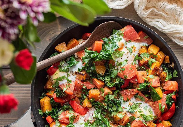 Butternut squash for breakfast? You bet! Dice up a few cups of butternut squash to star in this perfectly seasoned breakfast hash that’s loaded with eggs and other items from the produce aisle.