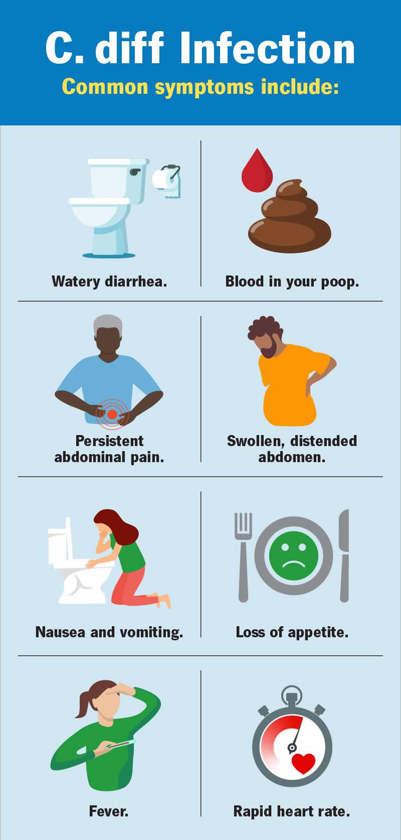 As C. diff infection becomes more severe, diarrhea increases. It may occur as much as 10 to 15 times a day. You may notice traces of blood in your poop or other symptoms, like: