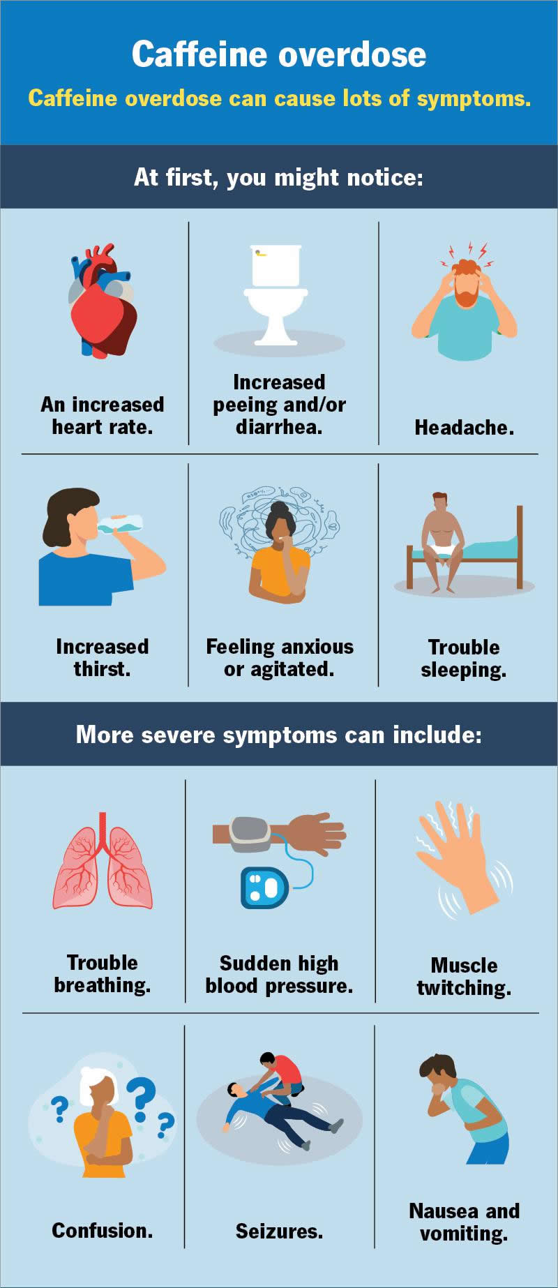 It usually takes a large amount of caffeine to cause an overdose, but it can cause some serious symptoms. Get medical help or call a poison control center right away if you think you’re experiencing a caffeine overdose.