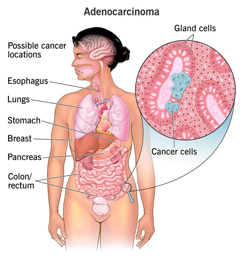 Risk factors for adenocarcinoma are significantly varied since these types of carcinoma may present in multiple organs, including your breast, prostate, pancreas, esophagus, colon/rectum, stomach, lungs, etc. Common risk factors include: