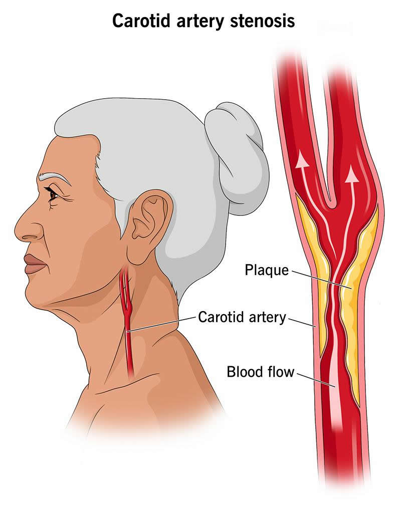 Carotid artery stenosis is a condition that happens when your carotid artery, the large artery on either side of your neck, becomes blocked. The blockage is made up of a substance called plaque (fatty cholesterol deposits). When plaque blocks the normal flow of blood through your carotid artery, you’re at a higher risk of stroke. Plaque build-up is called atherosclerosis.