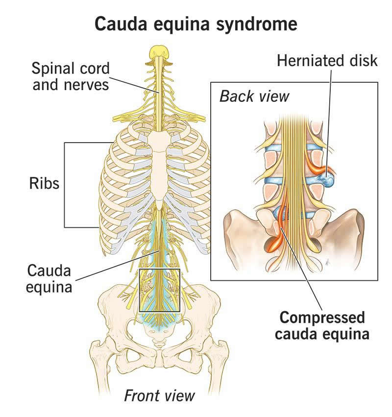 Cauda equina syndrome is a medical emergency that happens when an injury or herniated disk compresses nerve roots at the bottom of your spinal cord. The cauda equina nerves communicate with your legs and bladder. It causes back pain, weakness and incontinence. Quick surgical treatment may prevent permanent complications.