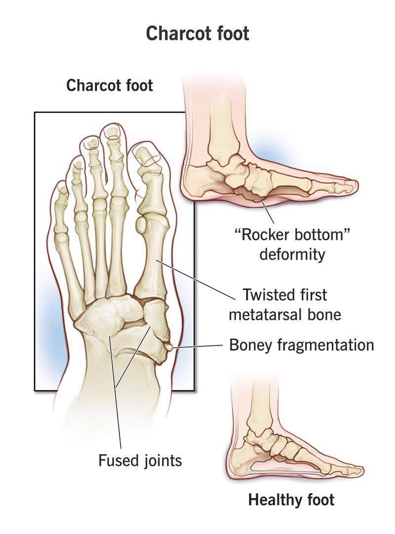 Diabetes-related neuropathy is nerve damage that makes you lose feeling in your lower legs and feet. This makes it hard (or impossible) to feel pain or notice other signs that something is hurting your foot. Charcot foot happens when a small injury or an infection causes severe complications because you can’t feel or notice the symptoms.