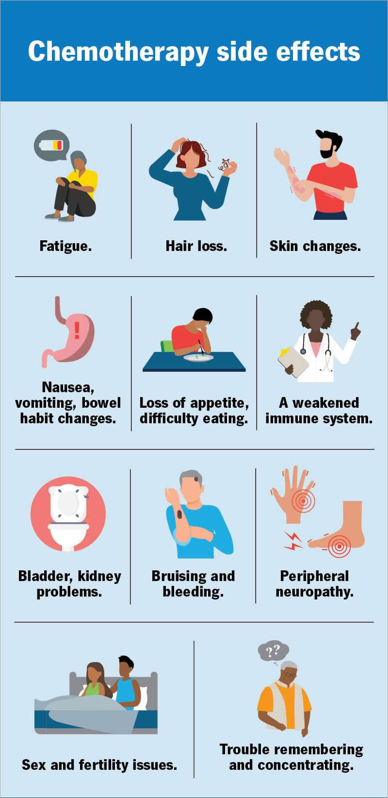 Some side effects may linger for months or even years. Others don’t start until after treatment and are long term. Potential long-term chemotherapy treatment side effects include: