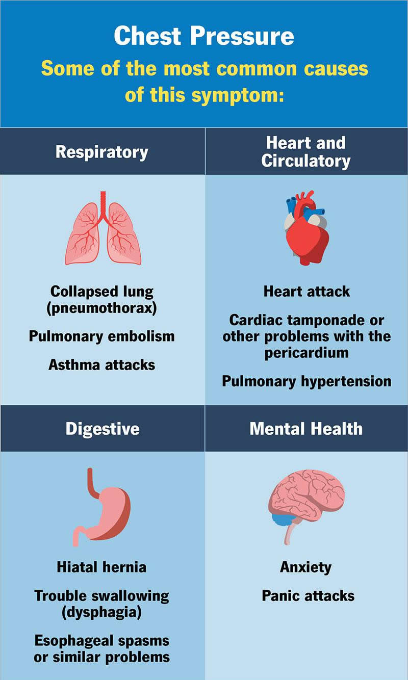 Chest pressure is a symptom that happens with many medical conditions. Some, like heart attacks, are life-threatening. Others are treatable with home remedies or over-the-counter medications. It’s important not to self-diagnose this condition and to talk to a healthcare provider quickly to make sure it isn’t a sign of a dangerous problem.