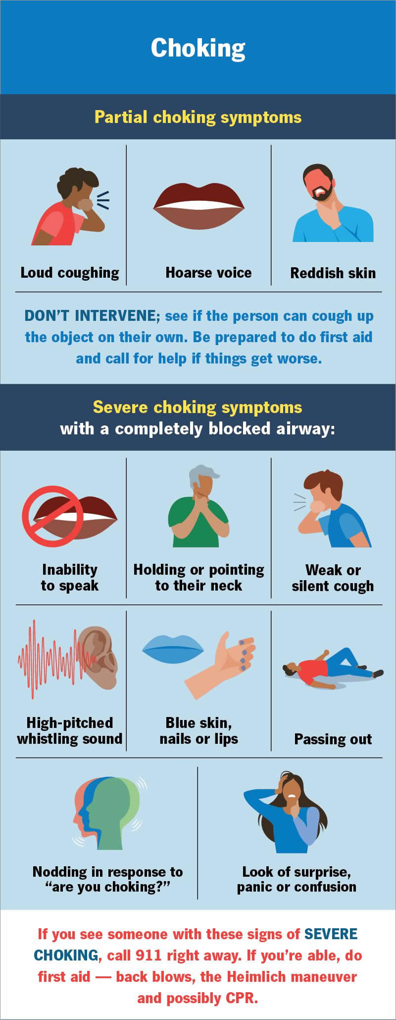Seek emergency care for yourself or anyone around you who’s severely choking. This means they can’t speak, breathe or cough effectively to dislodge the object that’s stuck in their airway. Every second matters and could make the difference between life and death.