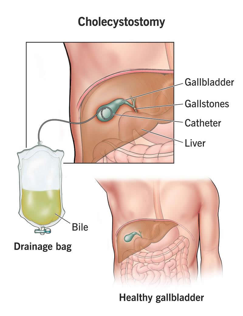 Most of the time, a cholecystostomy is a drainage procedure. Healthcare providers place a catheter (tube) through a percutaneous cholecystostomy to drain fluid from your gallbladder and relieve pressure, pain and, often, infection. This is an alternative treatment for people with gallbladder diseases who are too sick or aren’t good candidates to have surgery to remove their gallbladder.