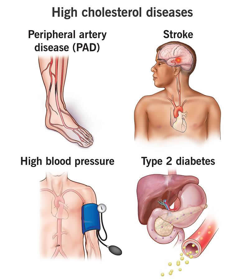 High cholesterol raises your risk of conditions like peripheral artery disease, high blood pressure and stroke. High cholesterol is common among people with diabetes.