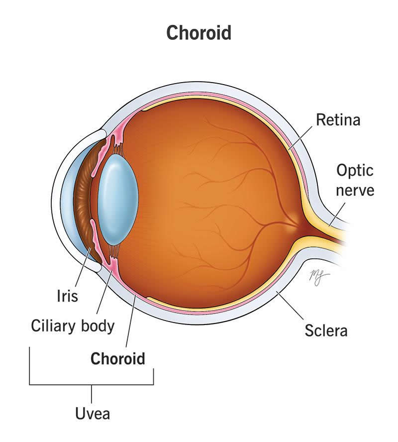 The choroid is a part of the uvea, the middle layer of your eyeball’s outer wall. It’s a key supplier of blood to some of your eyes’ most critical structures. The choroid (pronounced “KOR-oid”) also plays a role in how light acts inside your eye, making it a crucial part of how you see the world around you.