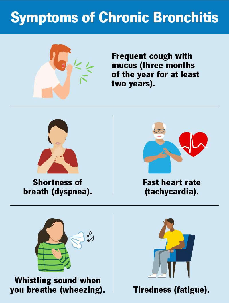 Chronic bronchitis is an inflammation of the airways (trachea, bronchi or bronchioles) in your lungs. People with chronic bronchitis have symptoms like a cough and shortness of breath most days of the month, three months out of the year, for two years or longer.