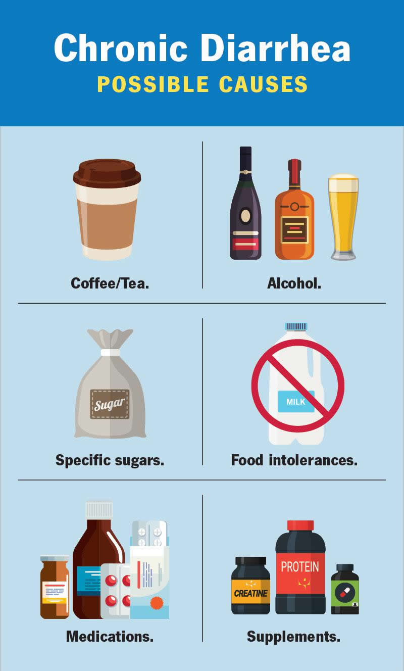 Many diseases can cause chronic diarrhea. But before looking for diseases, a healthcare provider will ask you about your diet and medications. These are some of the most common causes of self-induced chronic diarrhea, and also some of the easiest causes to fix. Possible causes include: