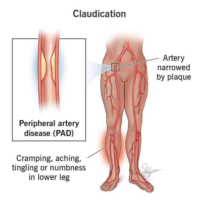 Claudication is a classic symptom of peripheral artery disease (a narrowing of the blood vessels in your legs) and atherosclerosis (hardening of the arteries). Peripheral artery disease and atherosclerosis increase your risk of heart attack and stroke.
