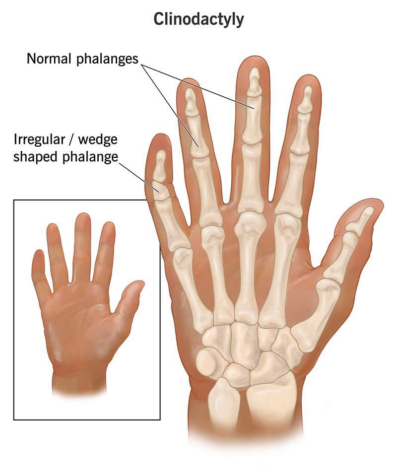 Several genetic conditions affect bone growth and cause clinodactyly as a symptom. These conditions include: