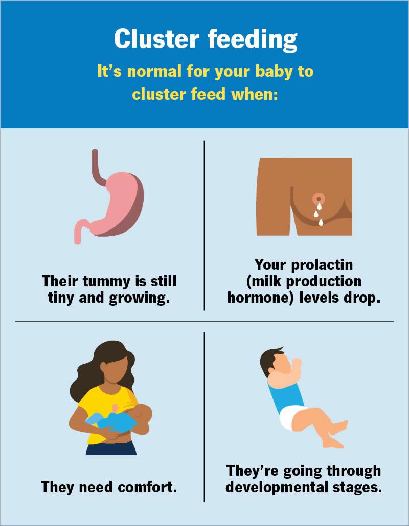 But keep in mind that cluster feeding isn’t a one-and-done stage. As your baby grows, they may need more frequent feedings to support growth, provide comfort or meet other needs. Your pediatrician or lactation consultant can tell you more about what to expect based on your baby’s medical history and growth trajectory.