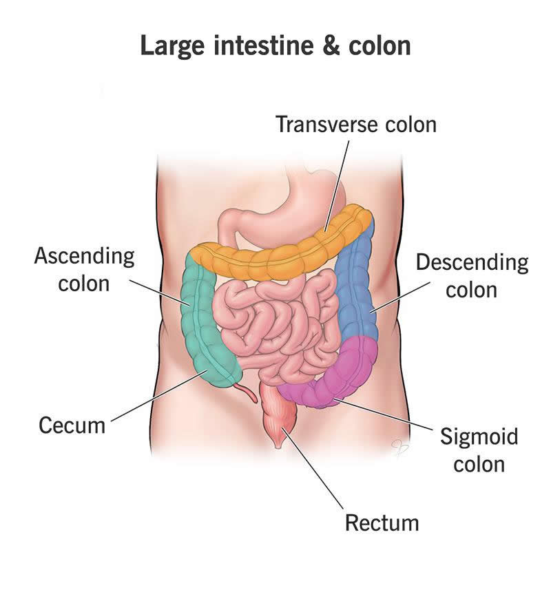 Your large intestine has three parts: the colon, rectum and anus. Each part does specific things to keep food waste moving through your large intestine.