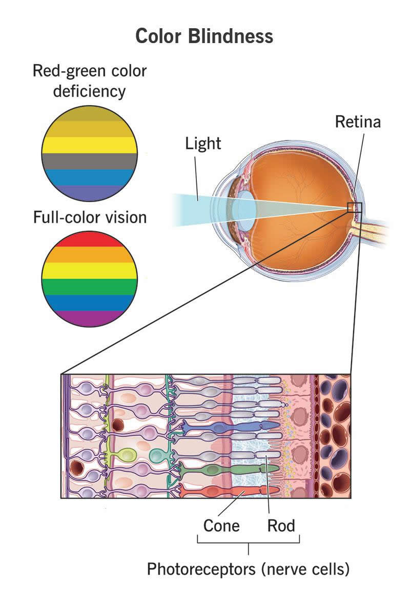 Color blindness (color vision deficiency) happens because special nerve cells in your retinas are missing or don’t work properly. This makes you see some colors differently than usual. Most people with color vision deficiency are born with it. See an eye doctor if you notice any changes in your eyes or vision.
