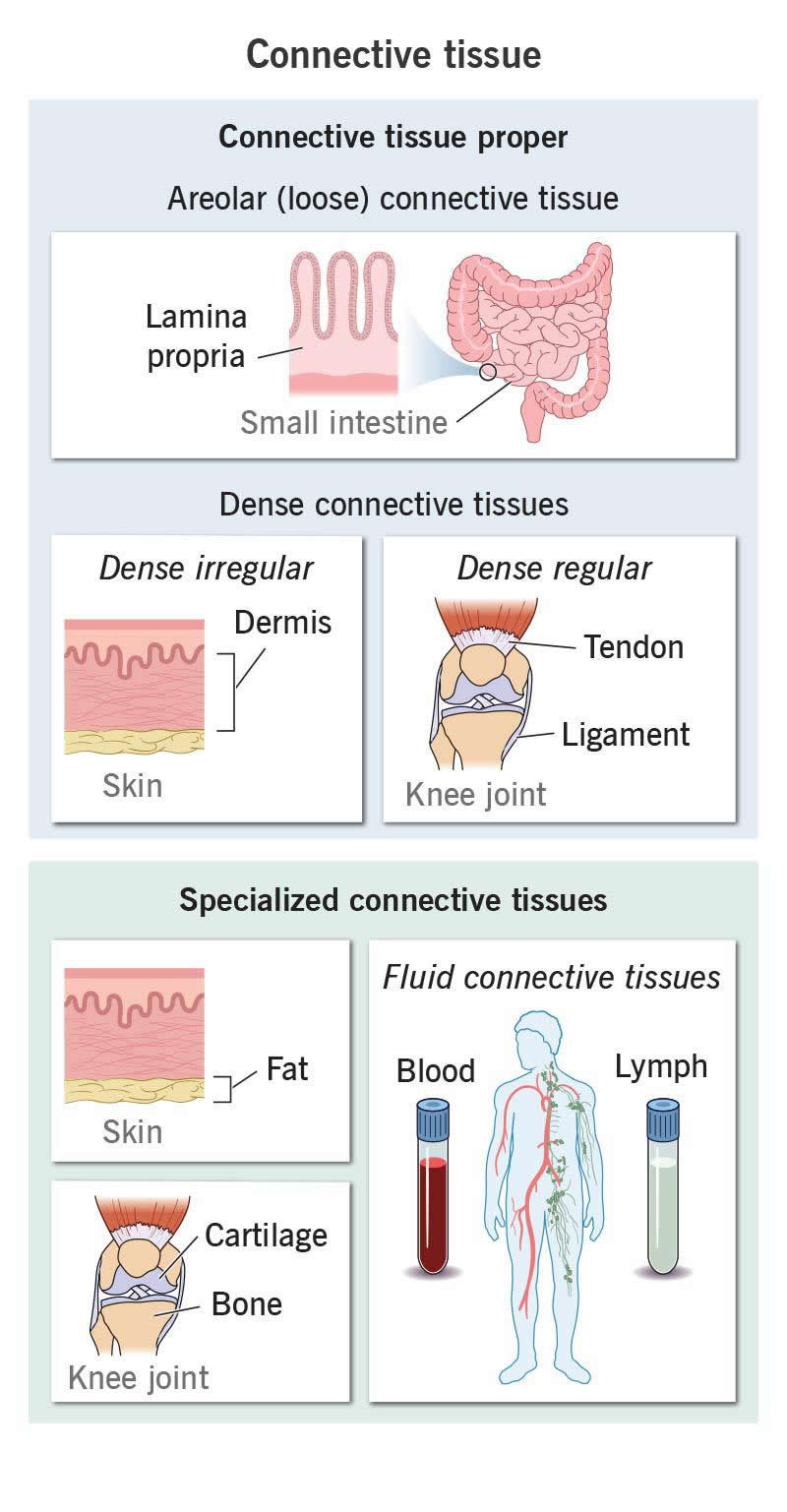 Connective tissue has two main types: connective tissue proper and specialized connective tissues.