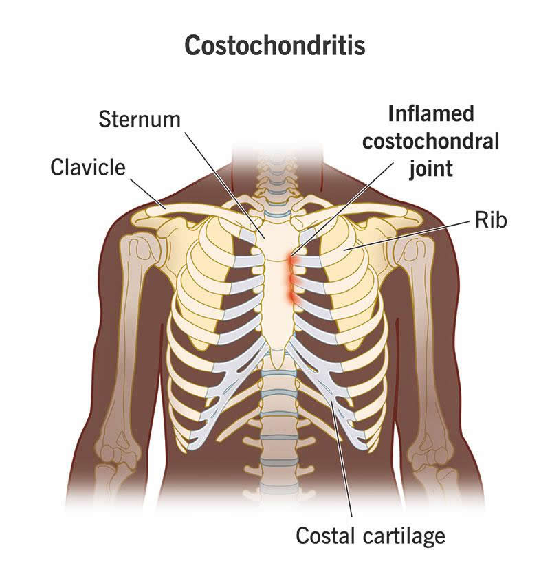 Costochondritis is inflammation in your costochondral joints — the cartilage that joins your ribs to your sternum (breastbone). It can be scary to feel chest pain, especially if it’s on the same side as your heart. But costochondritis isn’t a heart attack sign and doesn’t usually cause any complications.