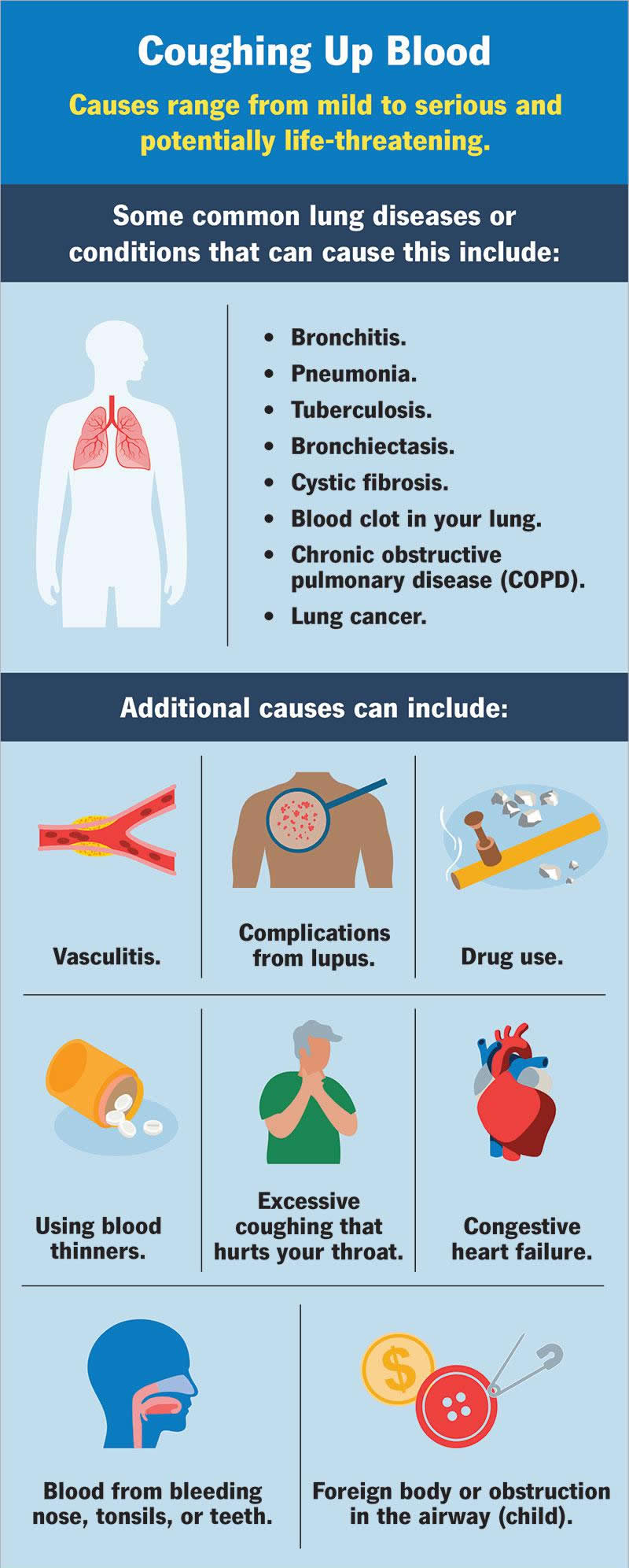 Coughing up blood involves coughing or spitting up blood or bloody mucus from your lower respiratory tract (lungs and throat). Also called hemoptysis (pronounced “he-MOP-tih-sis”), coughing up blood is common and can have many causes. Most causes aren’t serious. However, you may need to visit an ER immediately if you’re coughing up large amounts of blood.