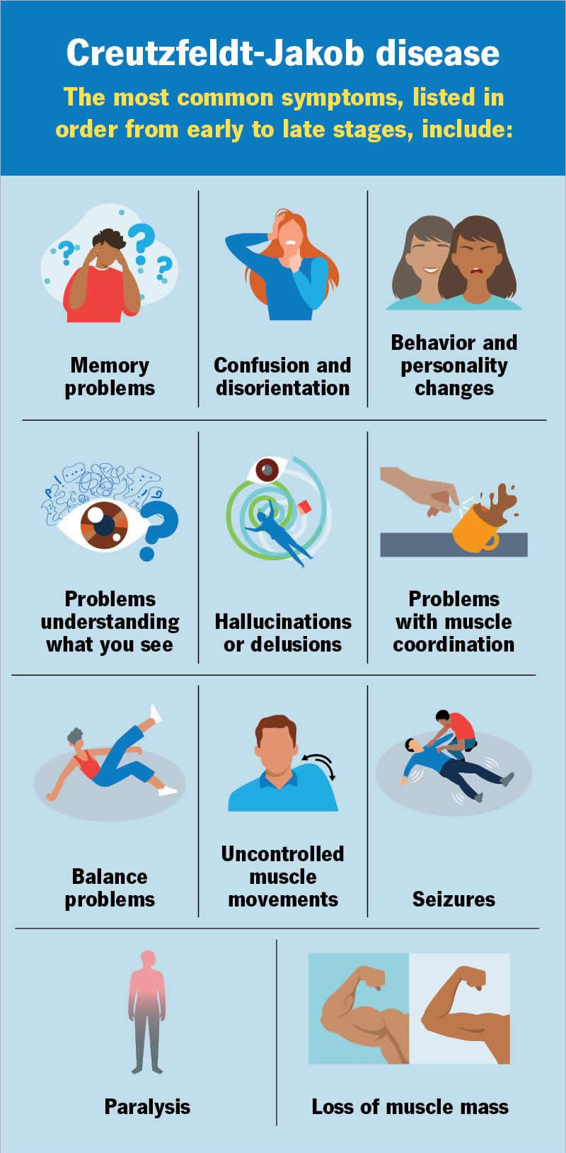 Creutzfeldt-Jakob disease can affect anyone. You may have prions for years before symptoms appear. But when they do start, symptoms progress very quickly as the disease damages and destroys more of your brain.