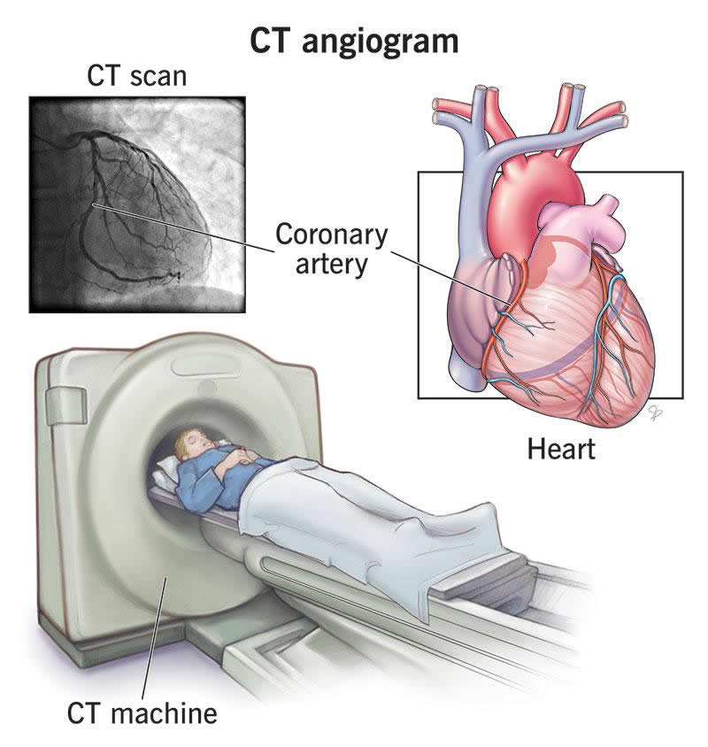 A computed tomography (CT) angiogram is a test that makes detailed pictures of your blood vessels and nearby tissues. The most common reason to have a CT angiogram is to see if you have narrowed or blocked coronary arteries (coronary artery disease). When done for these reasons, the test is sometimes called a coronary CT angiogram, or CCTA.