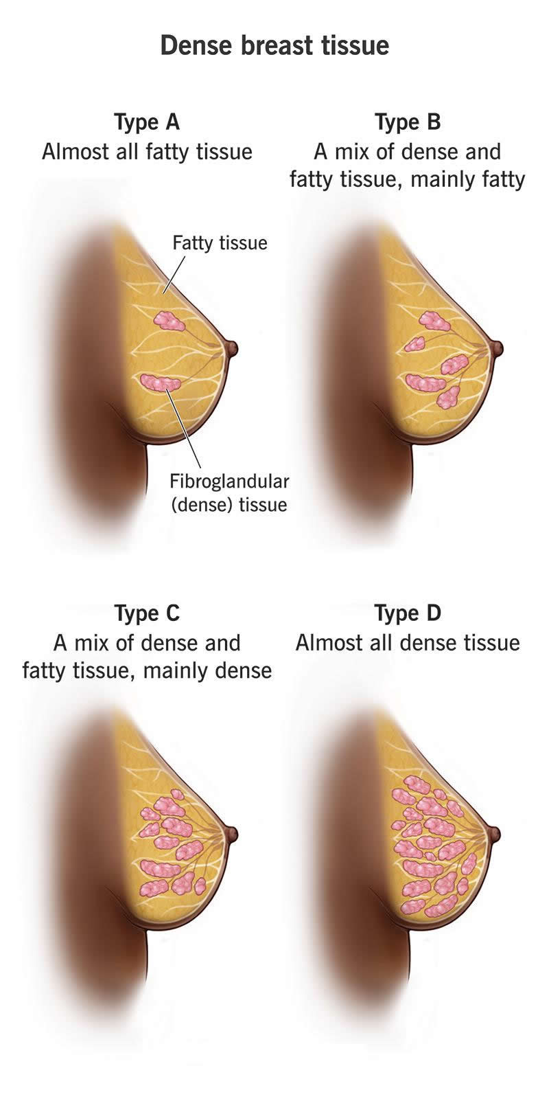 To understand dense breast tissue, it may help to know more about your breast tissues. There are three types of breast tissue:
