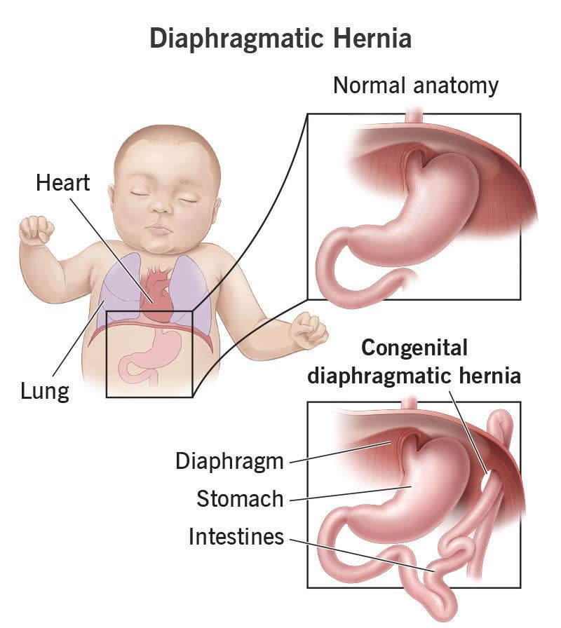 A congenital diaphragmatic hernia (CDH) is a type of hernia that occurs during fetal development. When abdominal organs move into a fetus’s chest, they can crowd its lungs. Babies born with CDH tend to have small, underdeveloped lungs and low blood oxygen. They’ll need immediate oxygen support and surgery to repair the hernia.