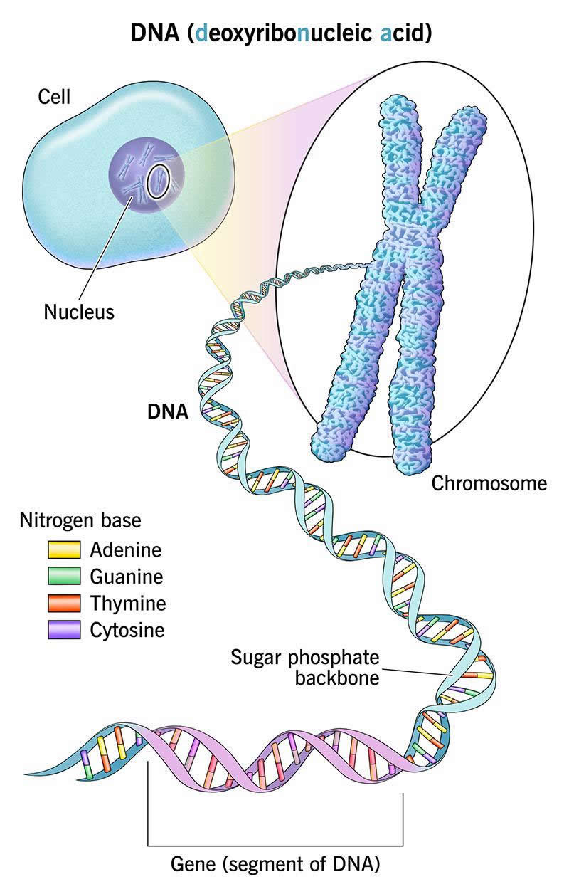 The letters in DNA stand for deoxyribonucleic acid (“dee-OCK-see-rai-bow-new-CLAY-ick A-sud”). A nucleic acid is an acidic substance found in the nucleus, or “brain” of a cell. “Deoxy” just means it has one less oxygen molecule in its structure than ribonucleic acid, or RNA.