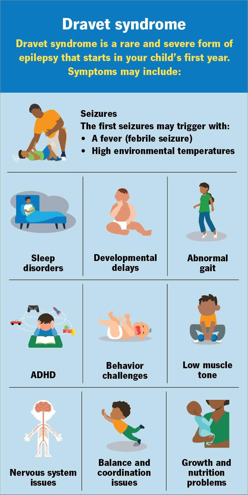 Dravet syndrome is a rare type of epilepsy. Seizures may last longer than five minutes. It can also affect your child’s development, movement and behavior. Longer seizures may raise the risk of serious health problems. Your child’s care team will create a treatment plan to keep them safe.