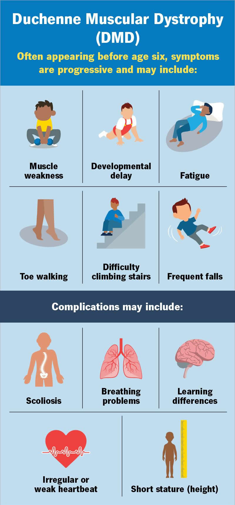 Duchenne muscular dystrophy (DMD) is a condition that causes skeletal and heart muscle weakness that quickly gets worse with time. Symptoms usually begin by age 6. The disease mainly affects boys. There currently isn’t a cure. Treatment involves managing symptoms and improving quality of life.