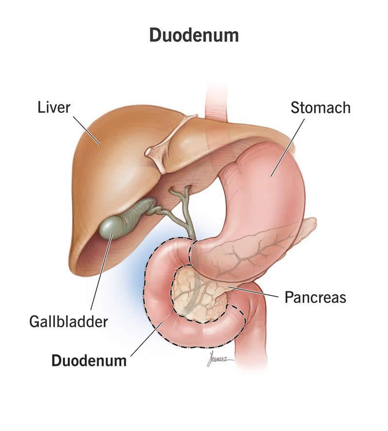 Your duodenum starts just below your stomach. It curves to the right and back, down and then to the left in a “C” or horseshoe shape. It slants upward slightly before joining with the next part of your small intestine, your jejunum. The head of your pancreas (the widest part) sits inside the “C.”
