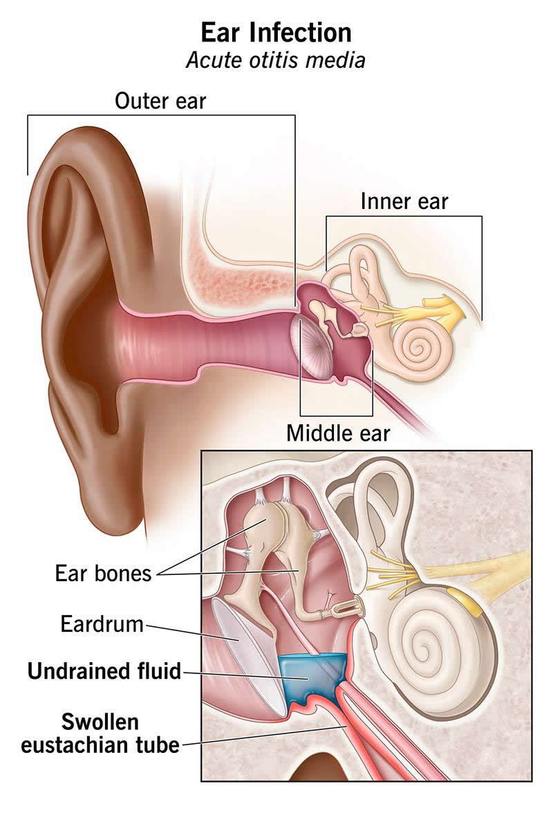 An ear infection, also called acute otitis media, is a sudden infection in your middle ear. The middle ear is the air-filled space between your eardrum and inner ear. It houses the delicate bones that transmit sound vibrations from your eardrum to your inner ear so you can hear.
