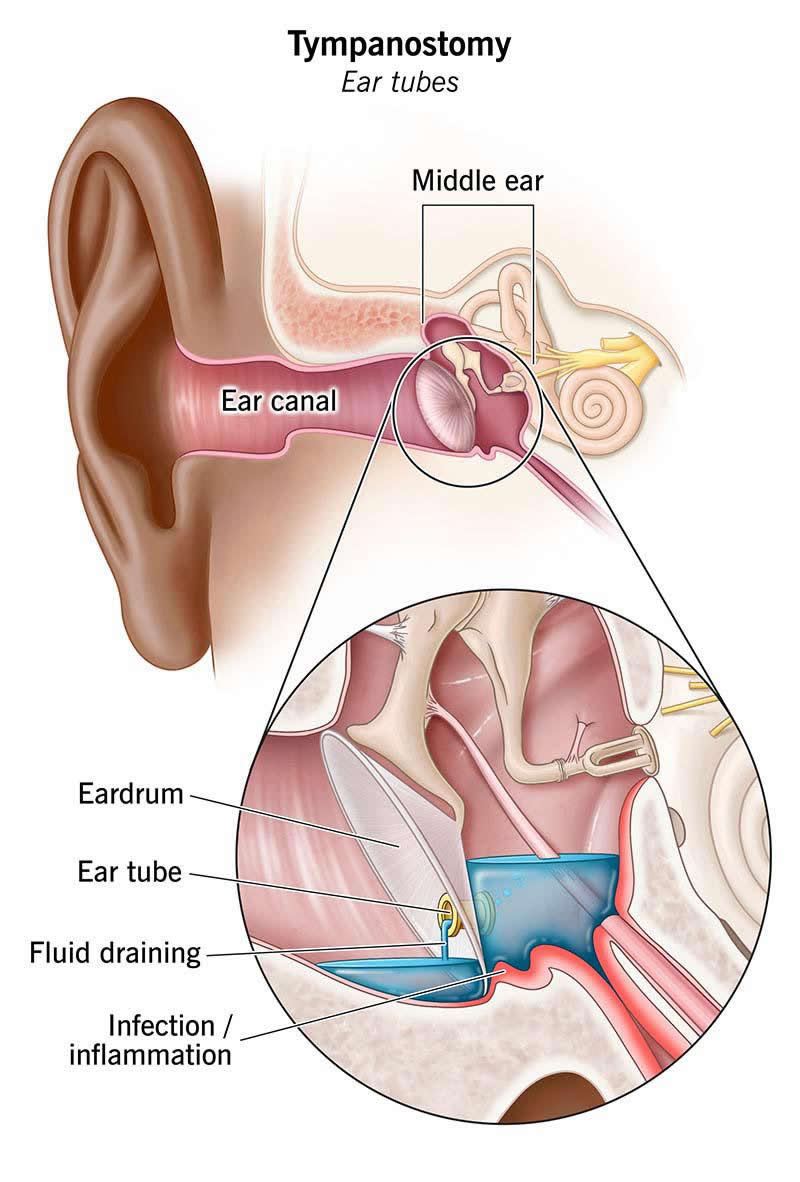 Tympanostomy is surgery to place ear tubes. Ear tubes are small, hollow cylinders inserted into your eardrum. They’re often used in children or adults who have chronic middle ear infections or infections that have resisted treatment.
